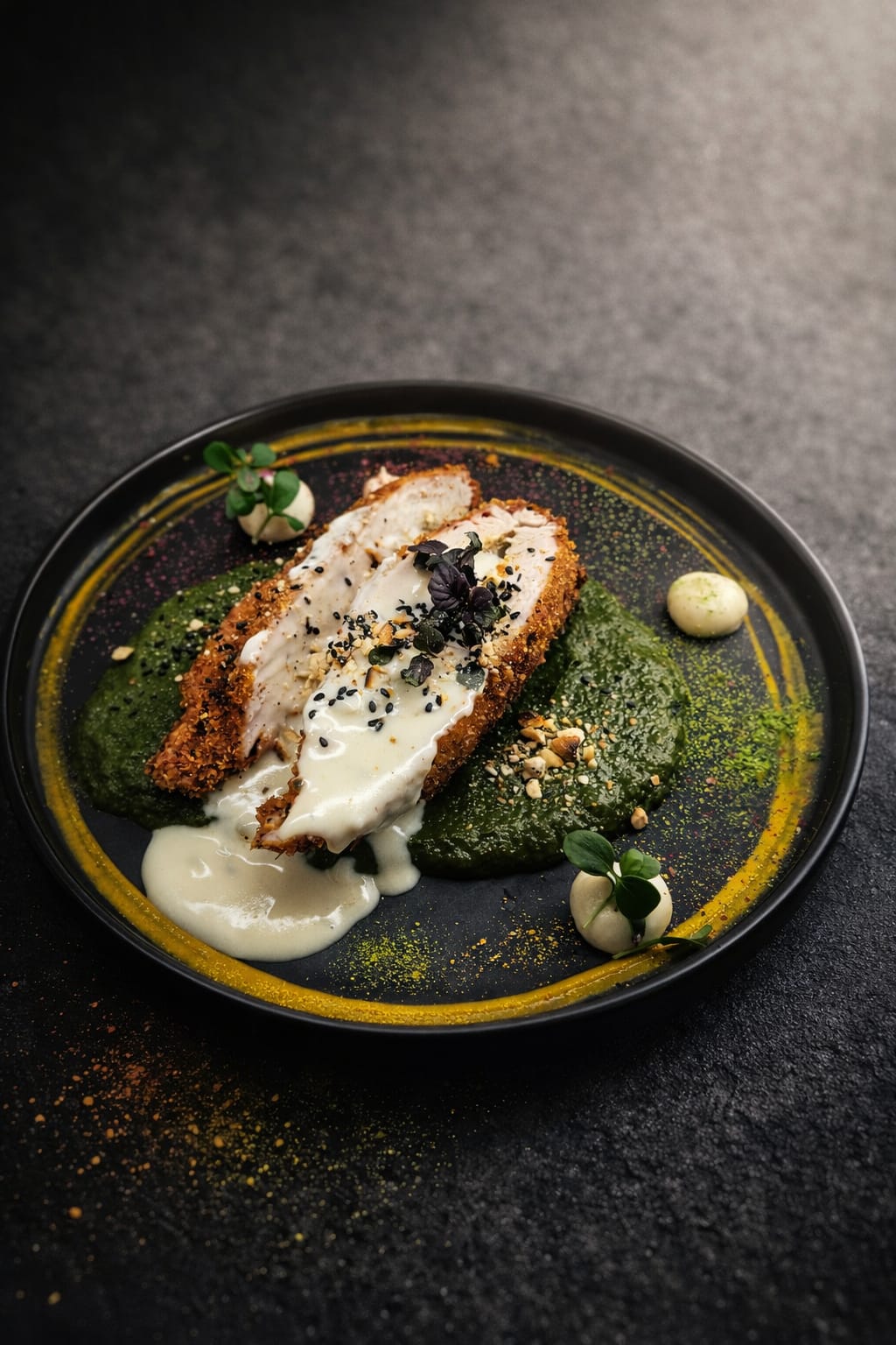 Serviert wird sie auf einem cremigen Spinatpüree, begleitet von einem feinen Gorgonzolasauce